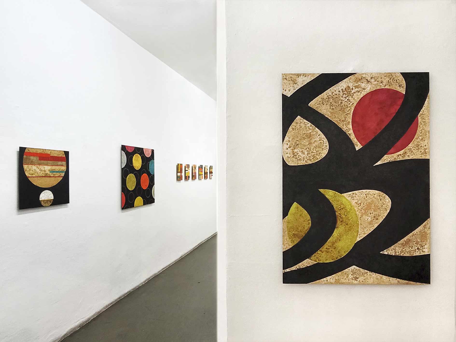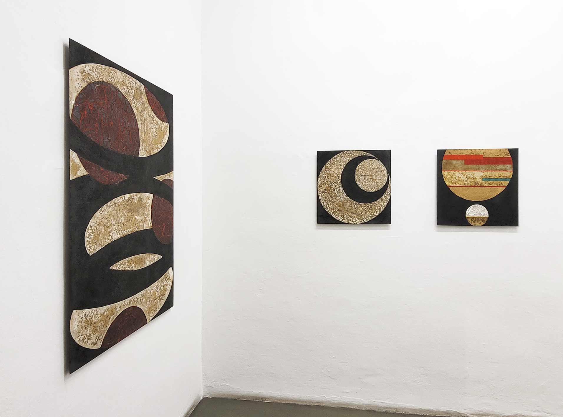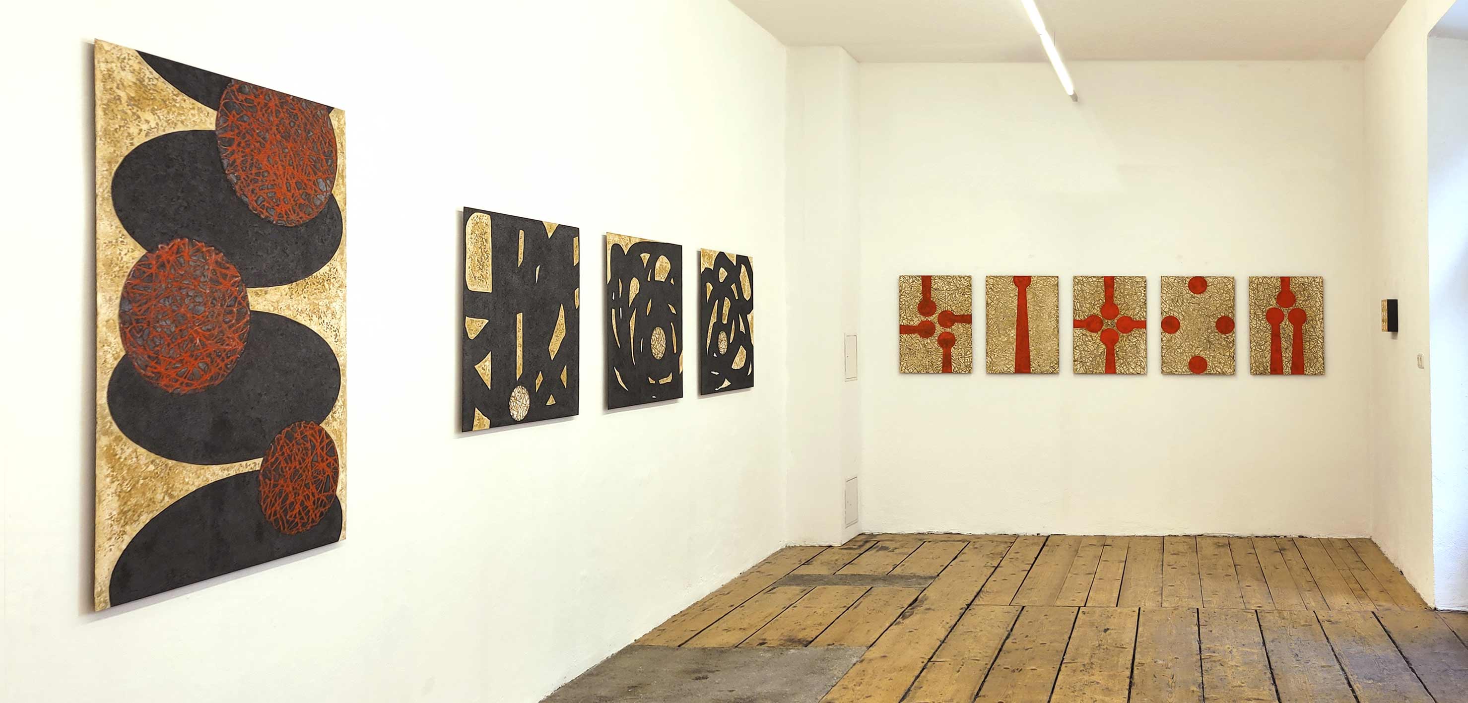 Glowing rock against an oscillating black background (Magma II), colorful discs on dancing serpentine lines (Luna Park): the associations are manifold. Black, red or earth-brown backgrounds envelop the viewers and invite them to immerse themselves in the surfaces. The seemingly monochrome spaces are modulated colors that rise and fall with incredible richness of nuance, created by pigments and the incidence of light.