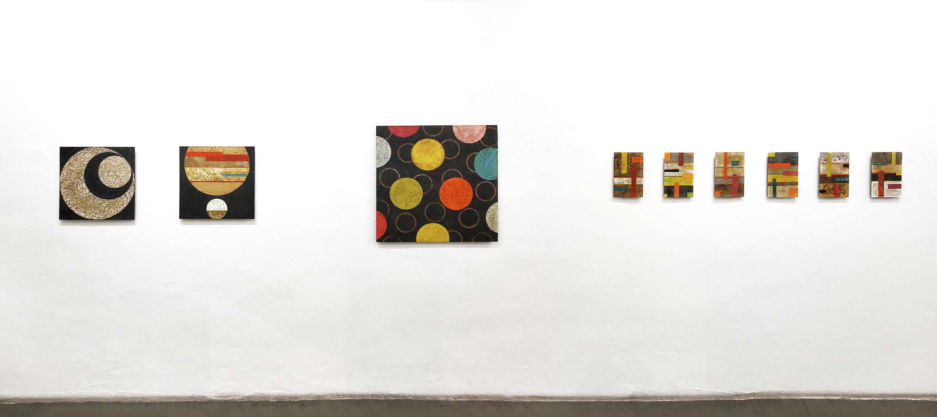 Black curved bands lead like burn marks to distant galaxies and create a unique aesthetic effect (Inktómis Pearl, Hidden Treasure, Flying up flying down, Roll over Mondrian). Conglomerates of circles dominate the picture plane and are reminiscent of cosmic movements (Into the Space, Once upon a Time, Planets, Sweet Seventeen, Dancing Colours, Behind the Moon). The number and distribution of the circular structures determine the dynamics and rhythm of the picture – endless and simultaneously closed, like a universe of its own. The dark backgrounds lend a special clarity to the color circles.