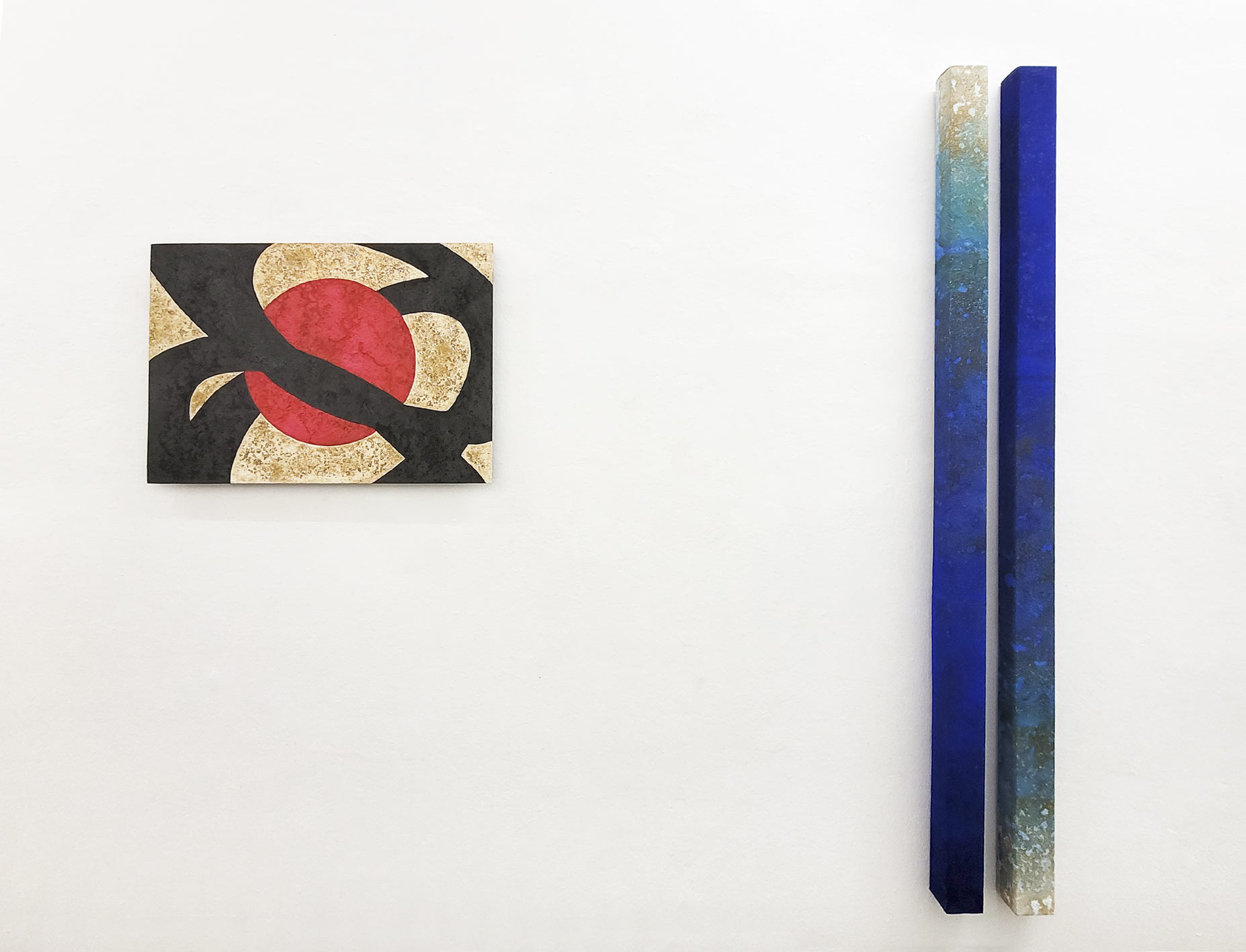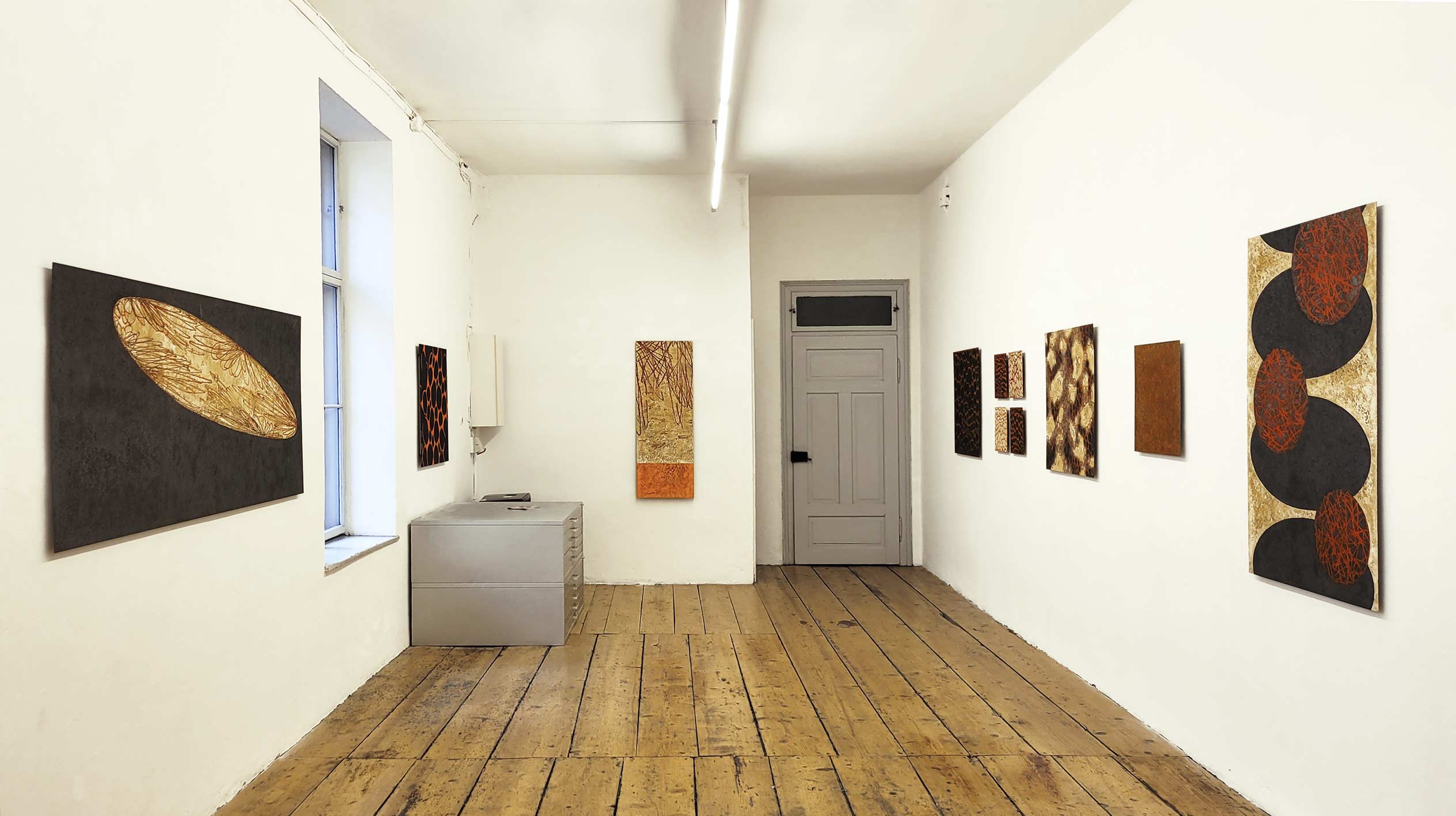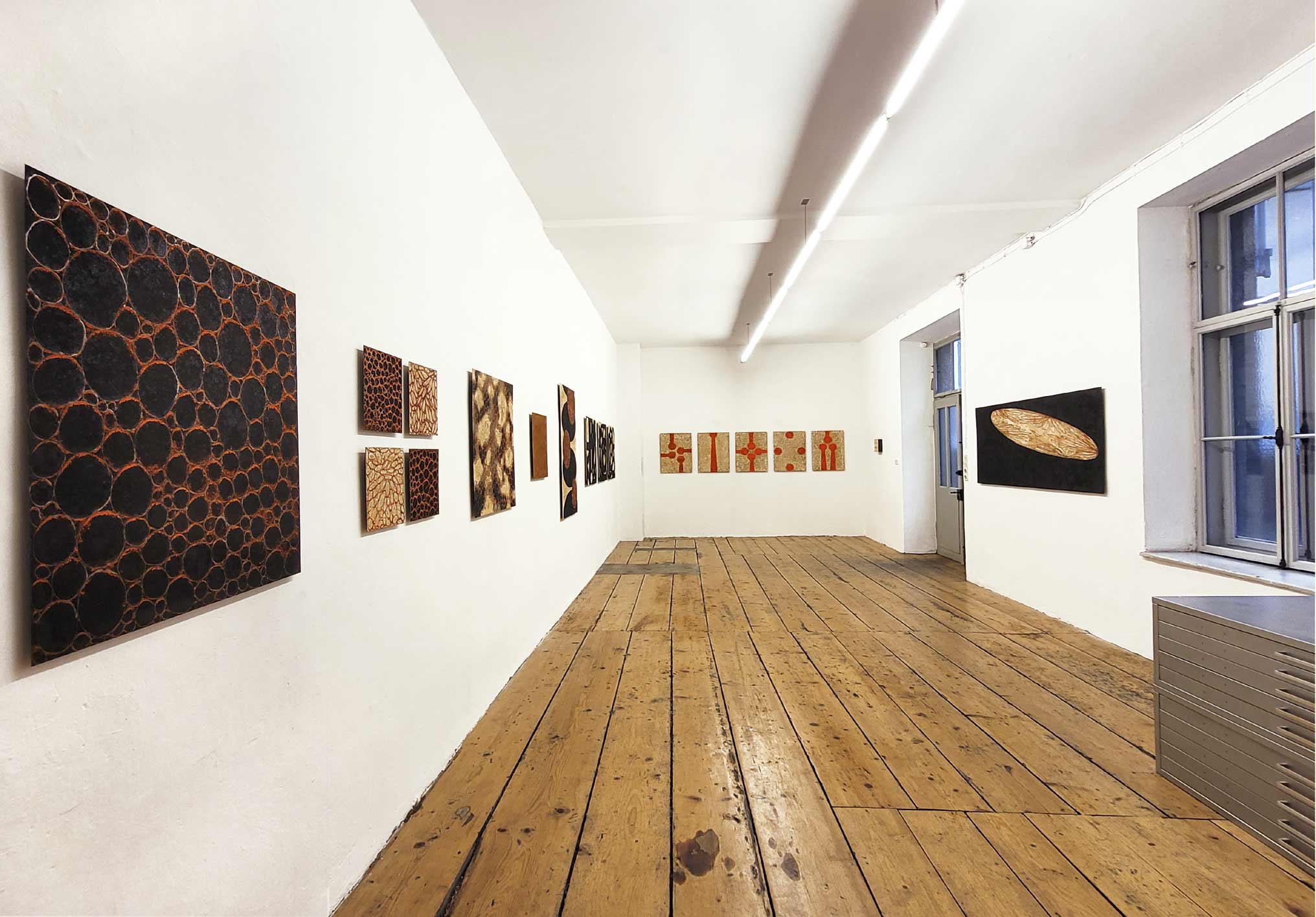 There are hints of the creative process, which the viewer cannot initially comprehend because the technique is unique. The artist pursues a decidedly experimental approach to image design and uses pigments, paper and image carriers in unusual ways. In a controlled process, she dusts color pigments onto an iron plate and scoops paper pulp over the surface. The moisture in the pulp causes the iron to oxidize. After drying, the paper bark is peeled off the iron plate, revealing randomly formed fragments and traces. The controlled randomness, the inherent passage of time, the oxidation of the pigments and the metal, the size and arrangement of the plates give the works their spiritual power. They are charged with meaning: hot iron, earth, wood, stone, growth and transience. Full of depth and throbbing with energy, the color fields embody memories and thoughts as materializations of change and stories.
